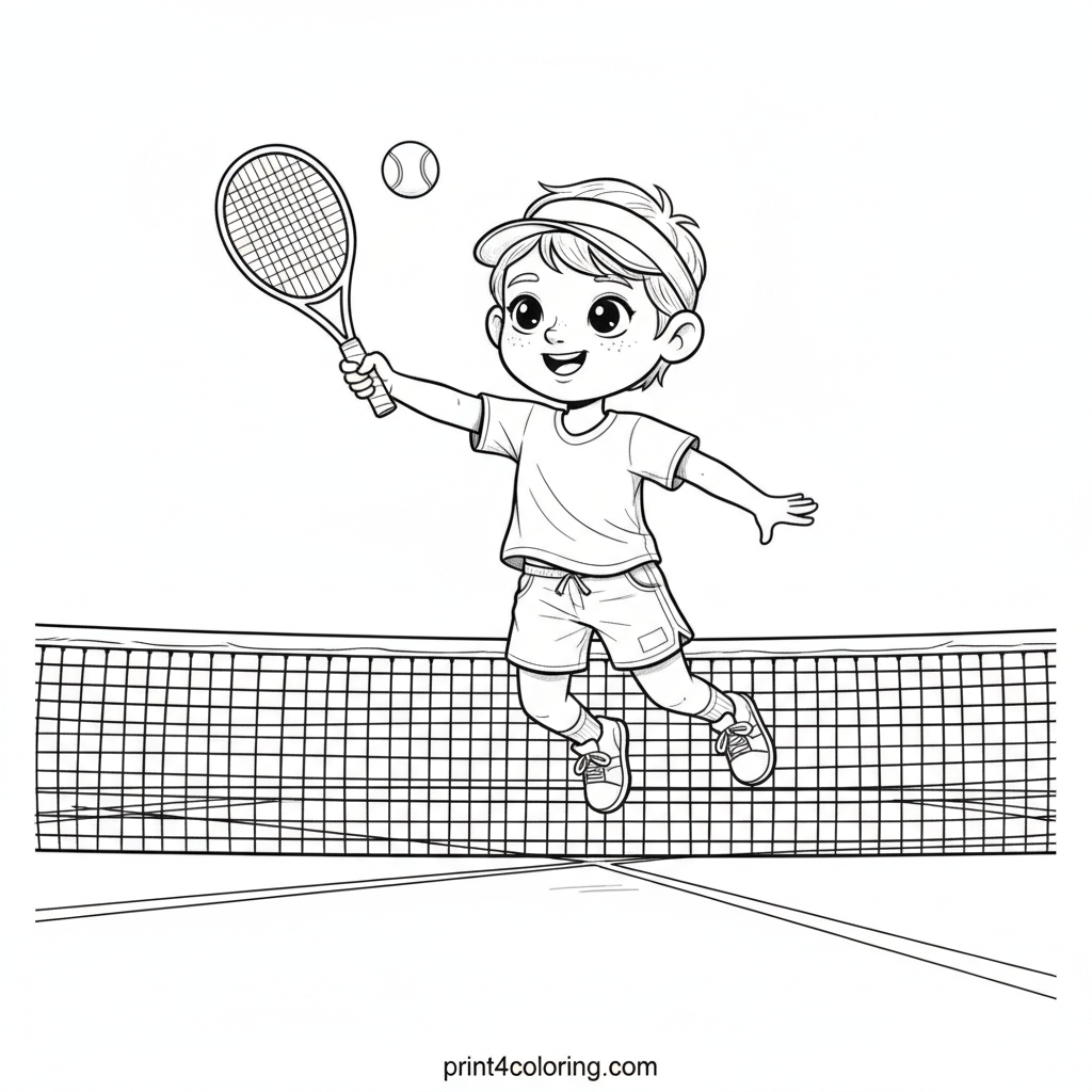 Witness the thrilling moment a young tennis player leaps high, racket poised to send the ball soaring over the net! This dynamic scene features intricate details on their athletic wear, the woven net, and sharp court lines, inviting you to bring the excitement of the game to life with your favorite colors.