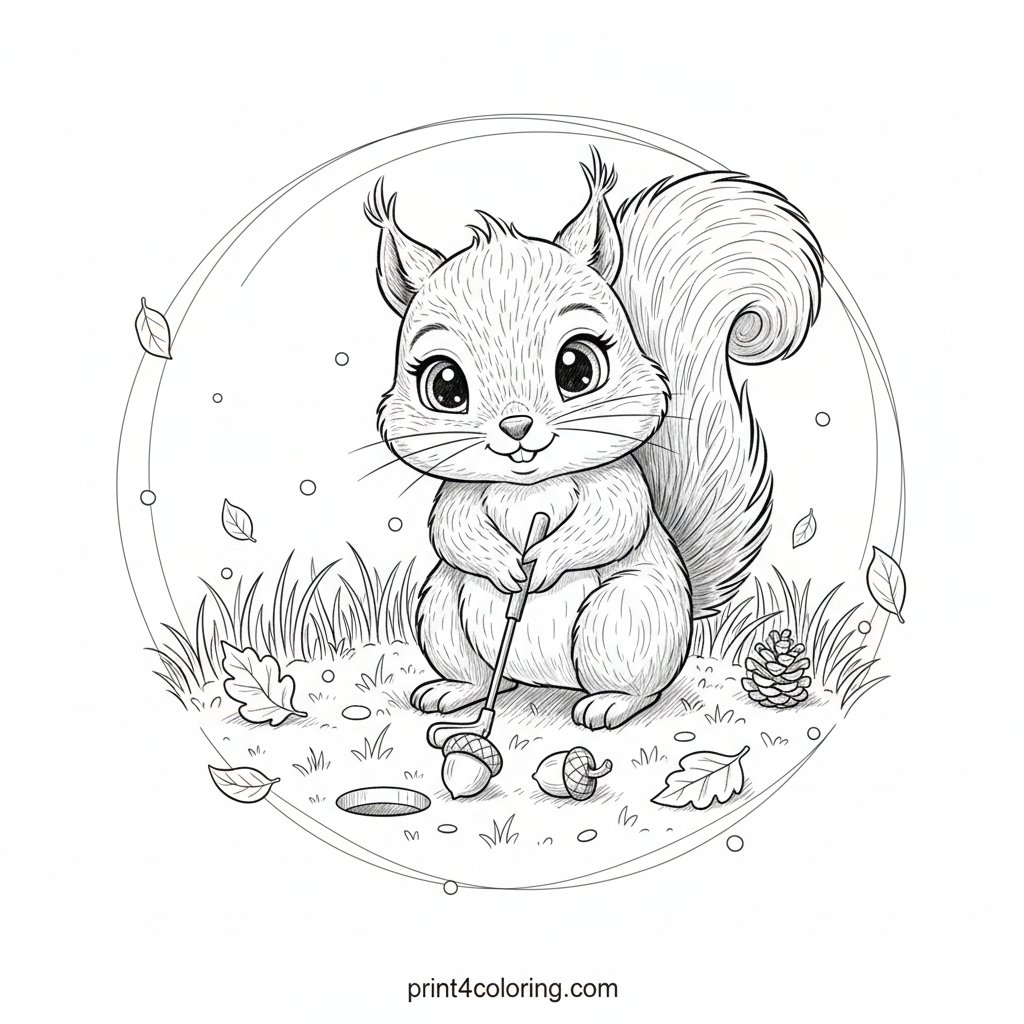 Join a charming squirrel on a miniature golf adventure! Watch as this tiny athlete, with a determined look and a minuscule club, tries to sink a perfect acorn putt. Surrounded by autumn leaves and pinecones, this cozy scene is full of delightful details waiting for your creative colors.