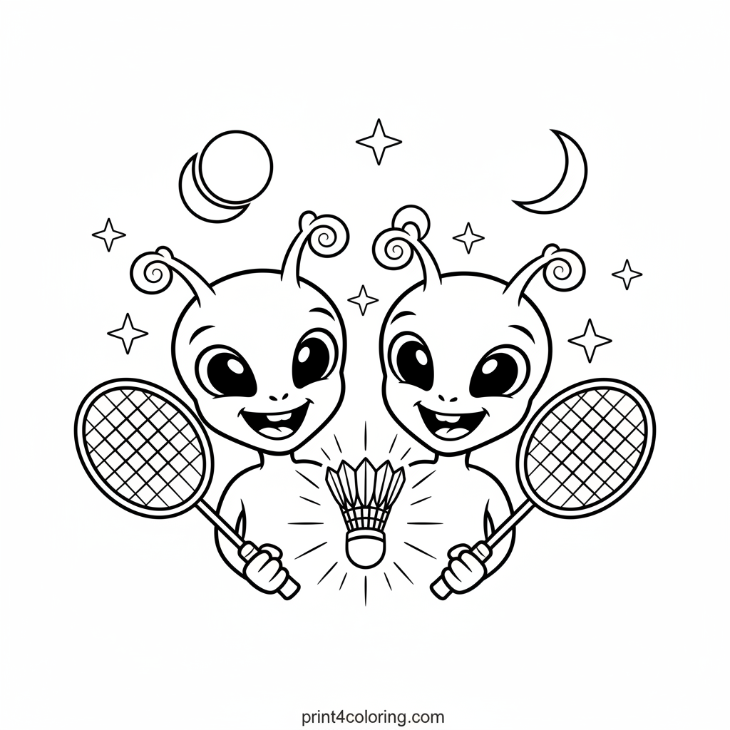 Join two friendly alien characters as they play an exciting game of badminton on a whimsical moon! With funny antennae and big eyes, they volley a glowing shuttlecock against a backdrop of twinkling stars and distant planets. This cosmic scene is ready for your imaginative colors to make it truly shine. Get ready for some extraterrestrial fun!