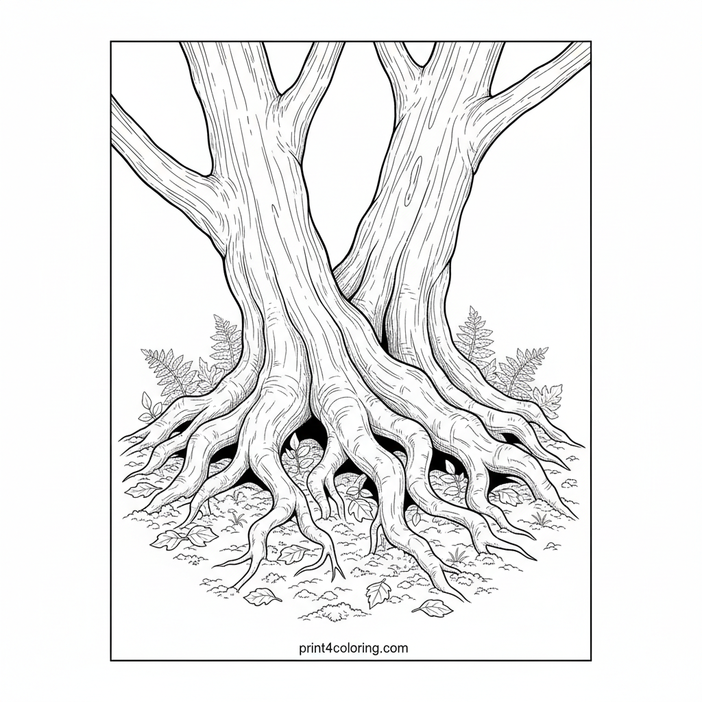 Dive into the heart of an ancient forest with this intricate coloring page. Witness two majestic trees, their gnarled roots gracefully intertwined and 'wrestling' for space, surrounded by delicate moss, lush ferns, and fallen leaves. A detailed challenge for aspiring nature artists!
