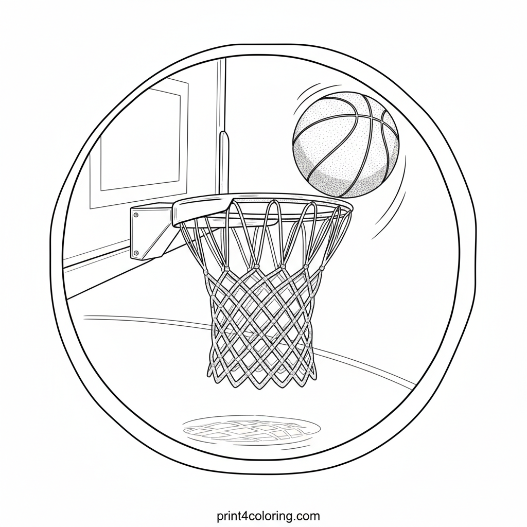 Capture the excitement of a perfect basketball shot! This expert-level page features a realistic, textured ball gracefully arcing towards a meticulously detailed net. Notice the intricate threads and the shadow it casts, with subtle court lines below. A fantastic challenge for aspiring artists and sports fans alike!