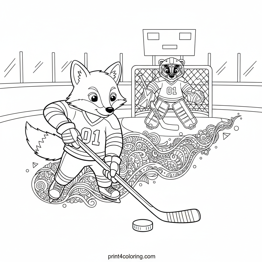 Dive into the thrilling world of ice hockey with Foxy, the speedy player, as they glide across the rink, stick ready for a powerful shot! Intricate ice patterns and swirling zentangle energy lines follow their path, while Bartholomew the friendly badger goalie stands ready in the net. A detailed scene perfect for advanced colorists!
