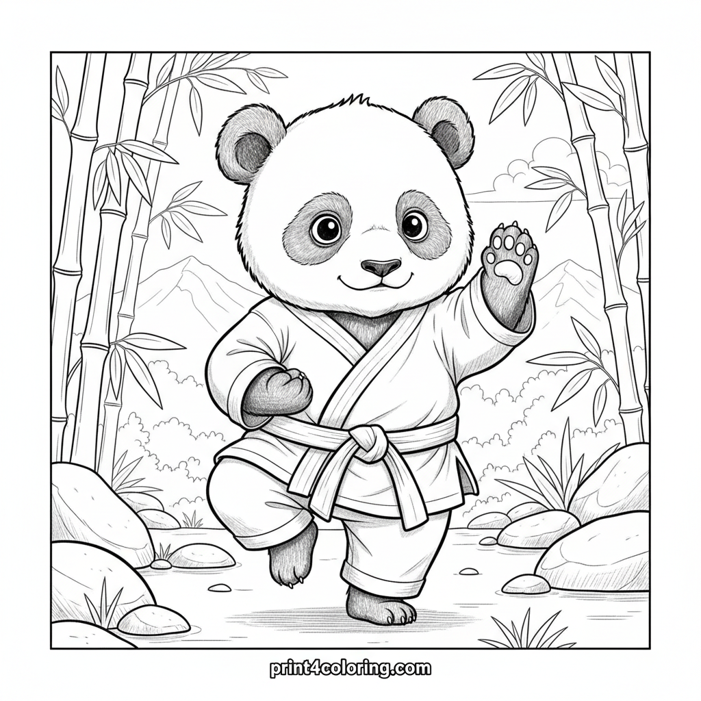 Step into a serene bamboo forest where a baby panda practices its martial arts. With soft features and focused eyes, this little master balances perfectly on one leg, wearing a neat gi. Bring this peaceful scene to life with your favorite colors, capturing its calm strength and the lush surroundings.