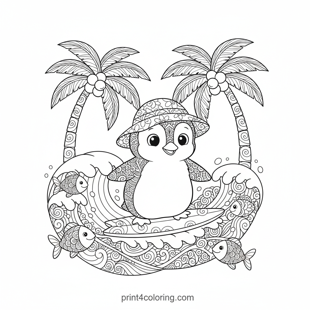 Dive into an adorable ocean adventure! A wide-eyed baby penguin in a tiny sun hat joyfully surfs a gentle wave on a miniature board. Intricate zentangle patterns fill the water, with friendly, smiling fish peeking out. Distant, beautifully patterned palm trees complete this charming, detailed scene, perfect for a challenging coloring experience.