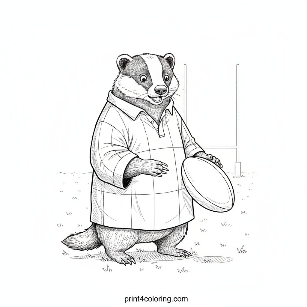 Get ready for a laugh with this expert coloring page! Our friendly badger is in a comical pickle, trying to master rugby but finding the ball a bit too slippery. With a huge striped jersey and a surprised expression, this scene is full of fine details from the badger's fur to the jersey's fabric, promising a fun coloring challenge for all ages.