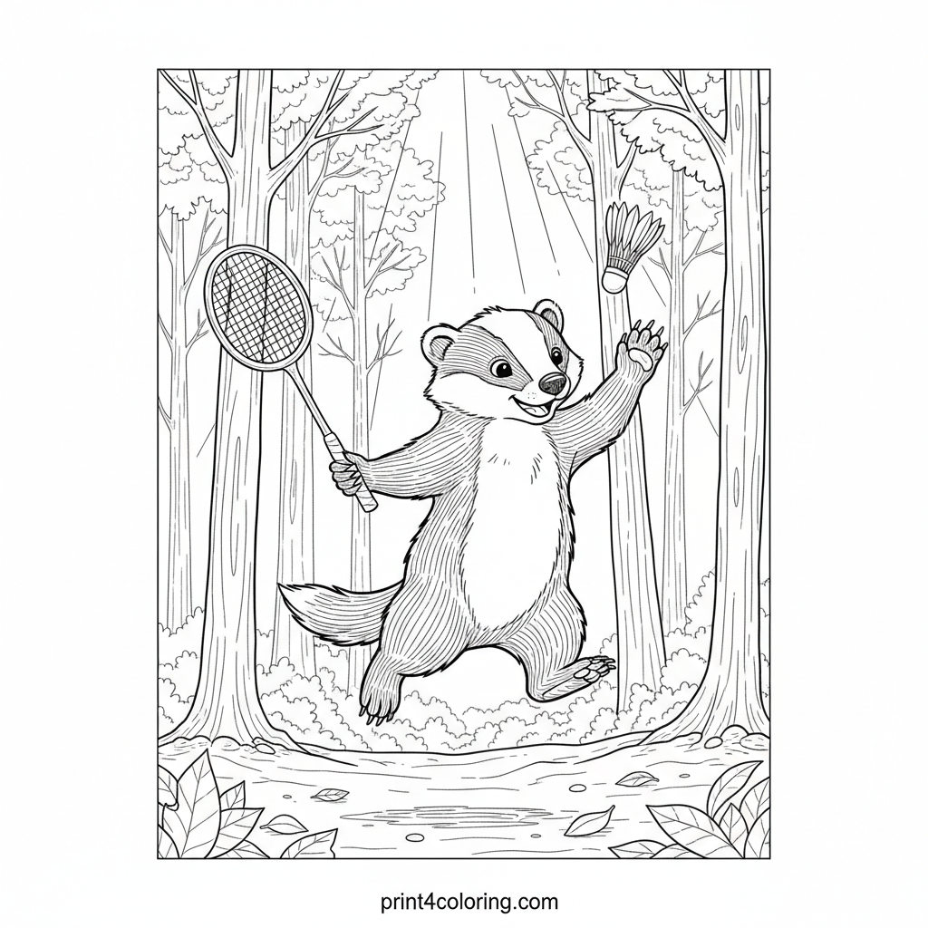 Witness an amazing badger in mid-air, leaping with incredible agility to hit a shuttlecock! This detailed scene captures our furry friend playing badminton in a beautiful, sun-dappled forest clearing. Tall trees frame the action, inviting you to add vibrant colors to its rustic racket and energetic fur. Get ready for high-flying forest fun!