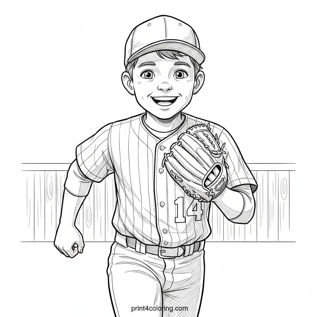 Capture the excitement of baseball with this joyful coloring page! A young player dashes happily towards first base, cap slightly askew, glove ready. The subtle outfield fence and sunny sky background await your vibrant colors. Imagine the cheers as you bring this dynamic moment to life!