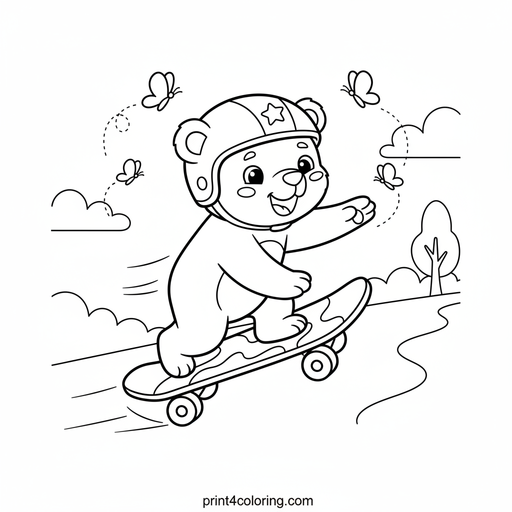 Watch this adorable bear cub zoom into action on its very first skateboard ride! Wearing a cool helmet and a big smile, our little adventurer is pushing off on a smooth park path. Friendly butterflies flutter nearby, cheering on this brave cub. Grab your crayons and bring this exciting moment to life with vibrant colors!
