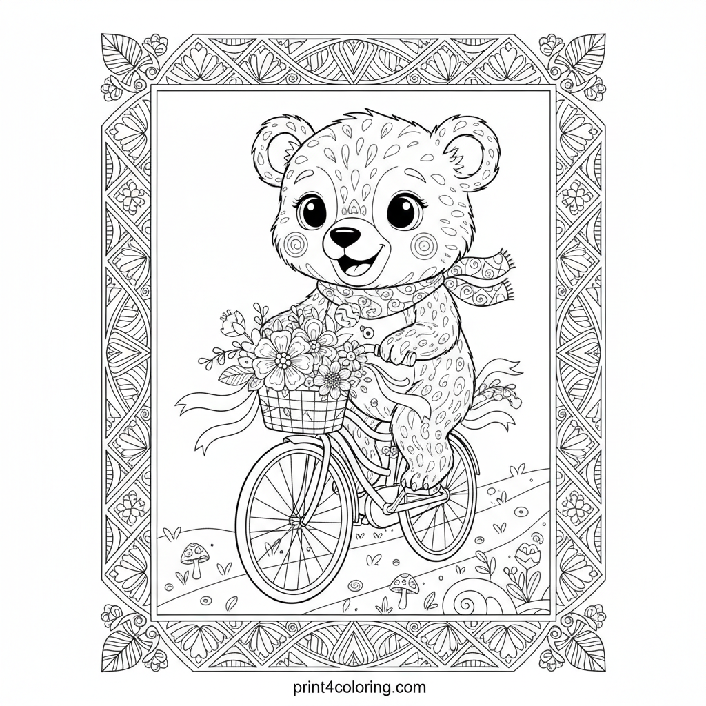 Follow a sweet bear cub with kind eyes on an enchanting bicycle journey! Our little delivery bear is pedaling a charming bike, adorned with intricate ribbons and beautiful zentangle flowers, carrying a basket of colorful blooms for its forest friends. Explore the winding path with detailed leaves and tiny geometric mushrooms.