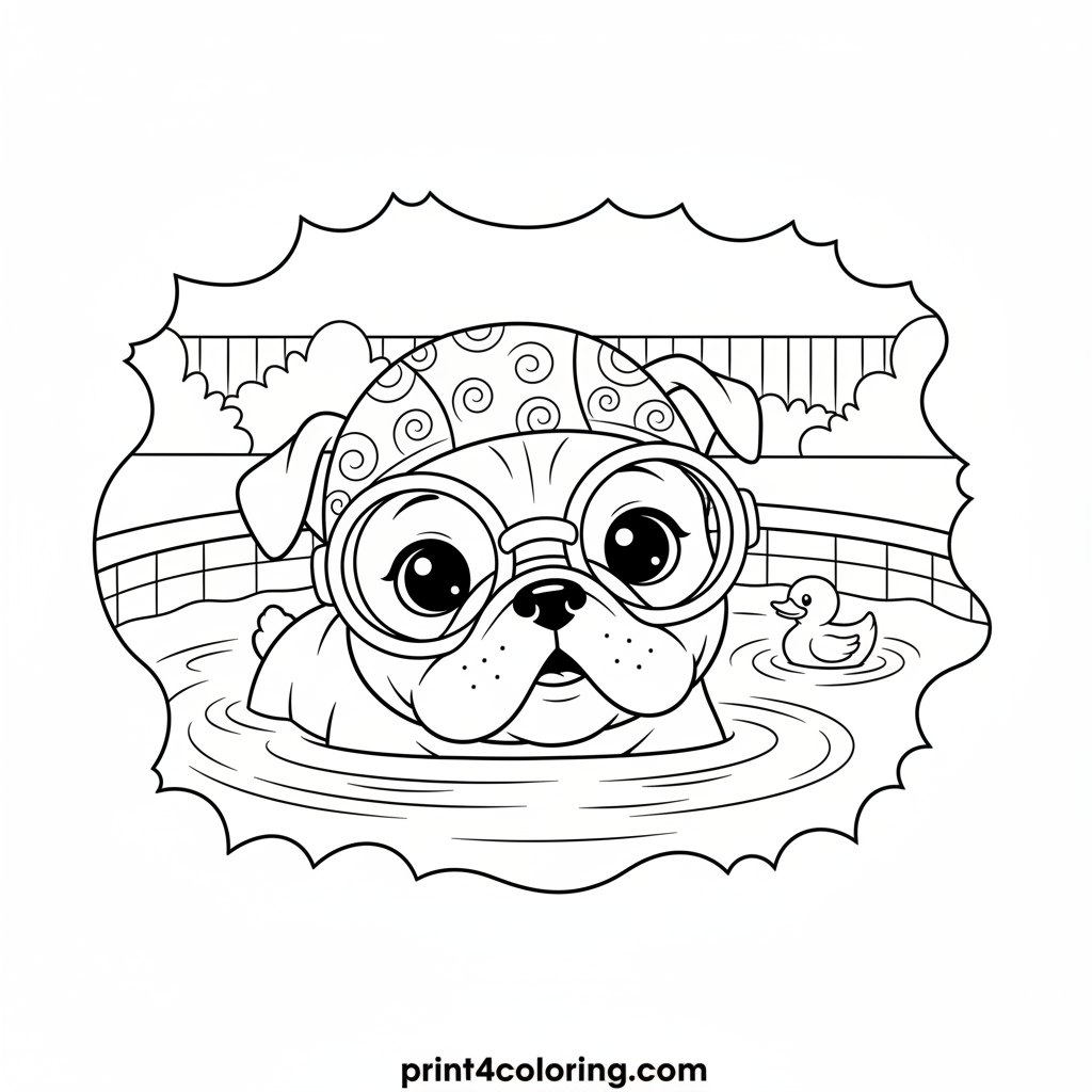 Dive into fun with this adorable coloring page! A determined bulldog, sporting oversized swim goggles and a vibrant swim cap, paddles energetically in a serene backyard pool. A tiny rubber duck floats nearby, adding to the charm of this comical and heartwarming aquatic adventure. Perfect for all ages!