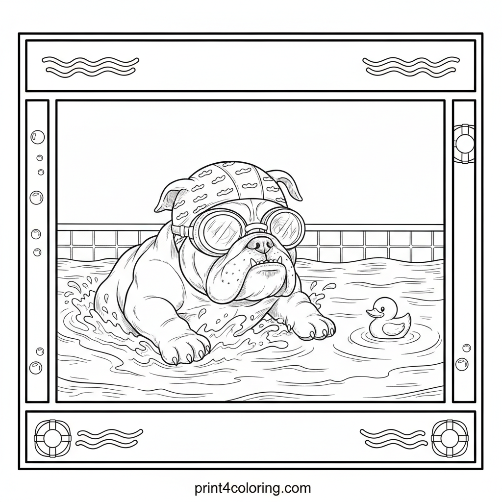 Dive into fun with this determined bulldog! Watch as our comical friend paddles vigorously in a calm backyard pool, sporting oversized swim goggles and a brightly patterned swim cap. A tiny rubber duck floats nearby, adding to the splashy scene. Get ready to add vibrant colors to this hilarious aquatic adventure!