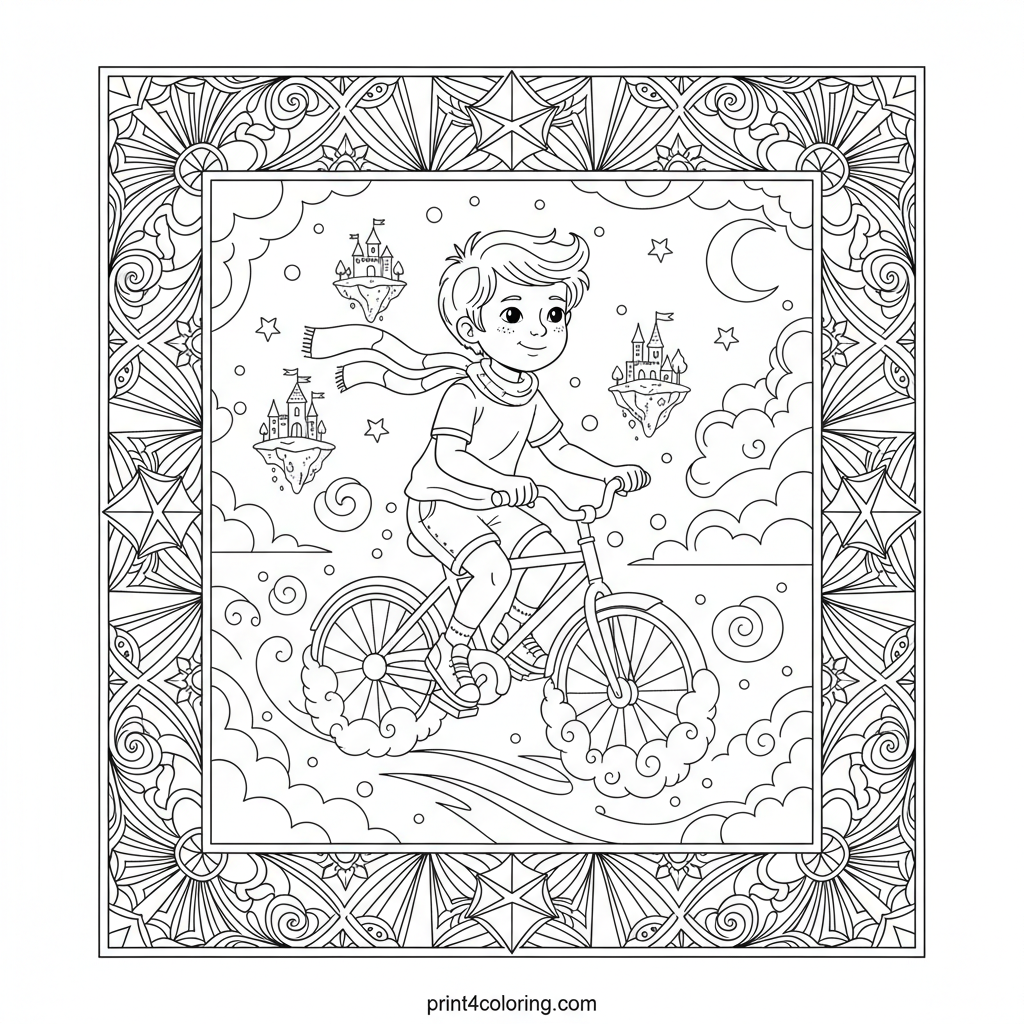 Embark on an epic sky adventure with our brave Sky Rider! A determined child pedals a sleek, cloud-wheeled bicycle through a sky alive with swirling air patterns. Explore distant, friendly floating islands, while subtle stars and moon phases twinkle in the background. A whimsical, challenging scene awaits your creative colors.