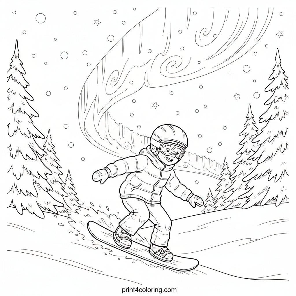 #snowboarding#night sky#aurora borealis#winter sports#fantasy landscape#coloring-page#printable