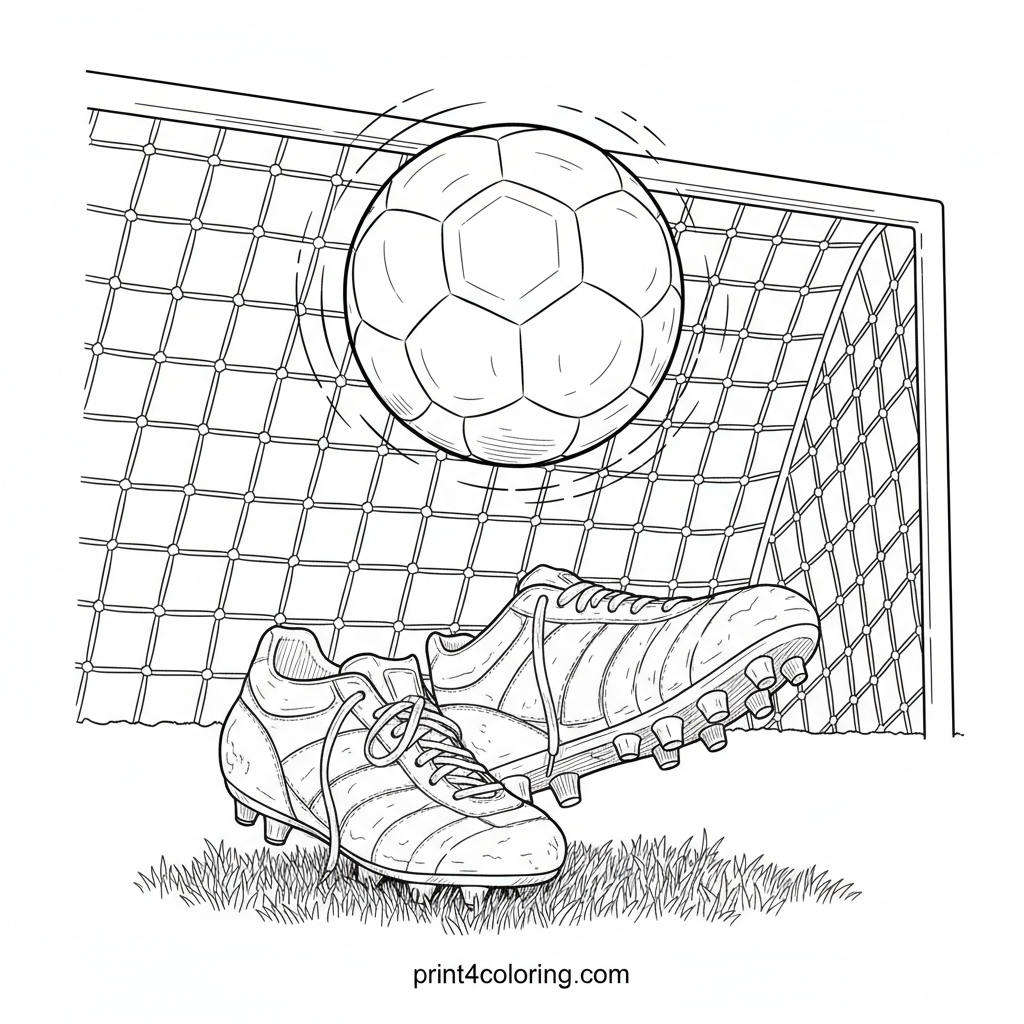 Get ready for an exciting match with this detailed coloring page! Imagine the thrill of the game as you bring to life a classic soccer ball, vintage leather cleats, and a realistic goal net. Color the textured grass and intricate stitching, preparing for the big kick-off. A perfect scene for future soccer stars!