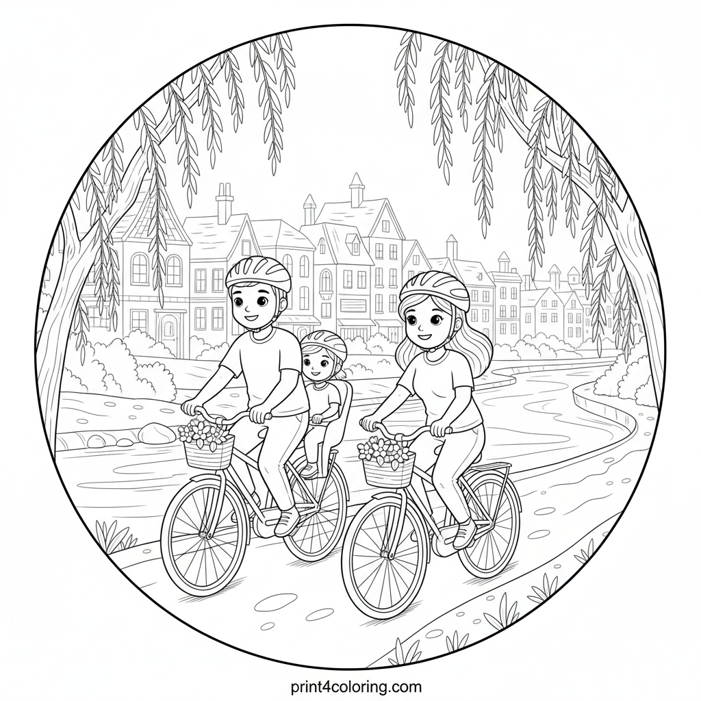 Embark on a delightful coloring journey with a family of cyclists enjoying a peaceful ride along a scenic riverside path. Intricate historical buildings grace the opposite bank, while graceful willow trees with countless individual leaves droop over the water, creating beautiful reflections. A charming scene perfect for detailed coloring!