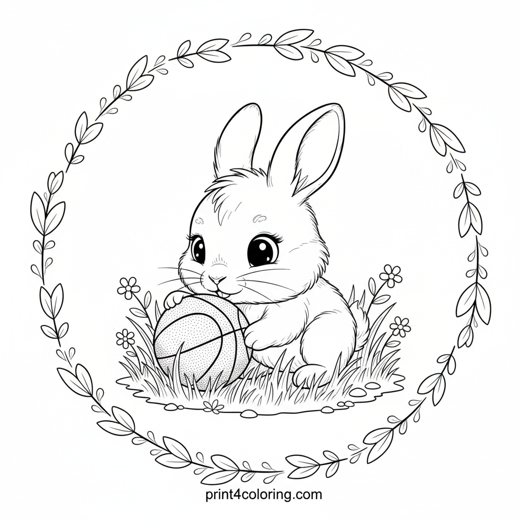 Meet an adorable baby bunny with the softest fur and big, curious eyes, gently nudging a tiny basketball. This charming scene features individual blades of grass and delicate wildflowers, inviting you to add vibrant colors. A realistic and heartwarming nature moment perfect for detailed coloring fun.