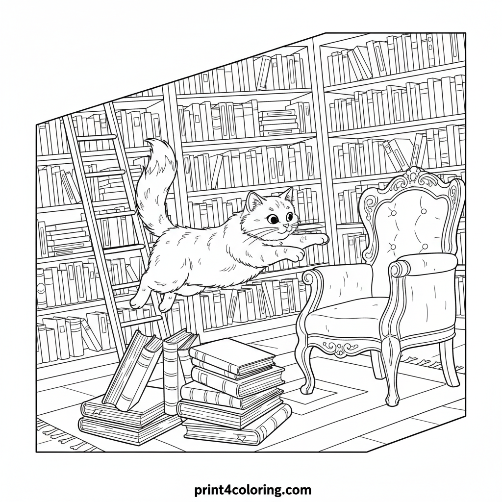 Join a curious, fluffy cat on an exciting bookstore adventure! Watch as this realistic feline nimbly leaps from a stack of vintage books to a cozy armchair. Explore a detailed, old-fashioned scene featuring packed bookshelves, a rolling library ladder, and a charming patterned rug, all waiting for your vibrant colors.