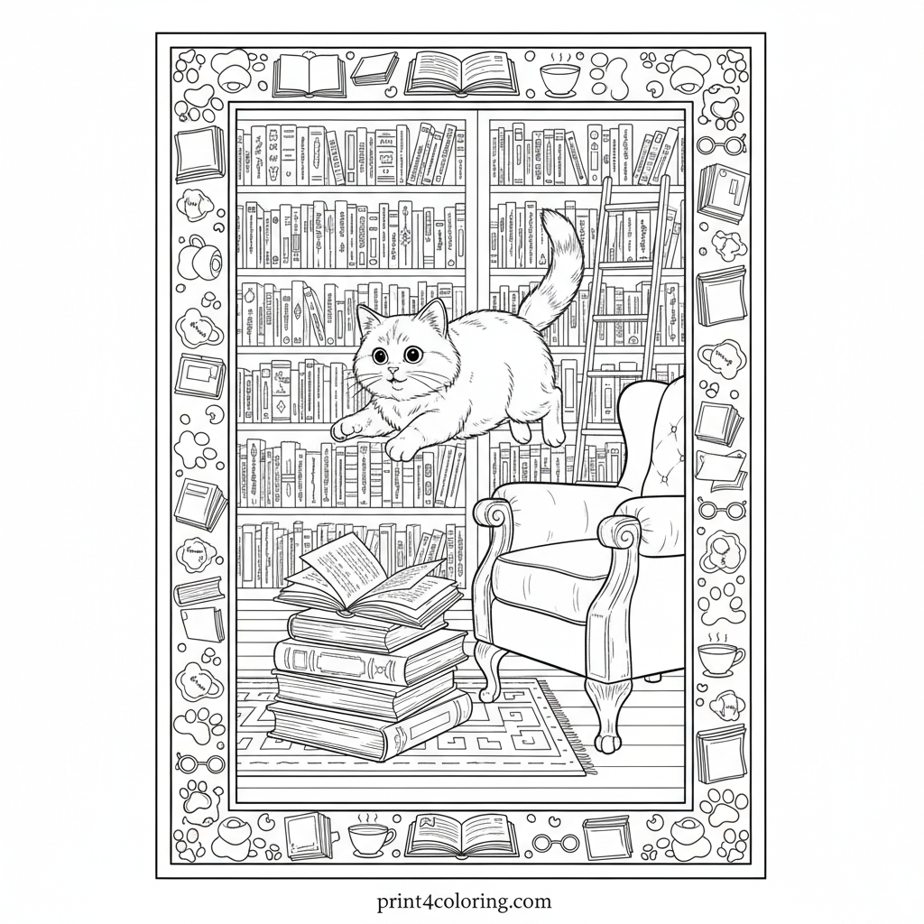 Curious Cat's Grand Bookstore Leap Coloring Page