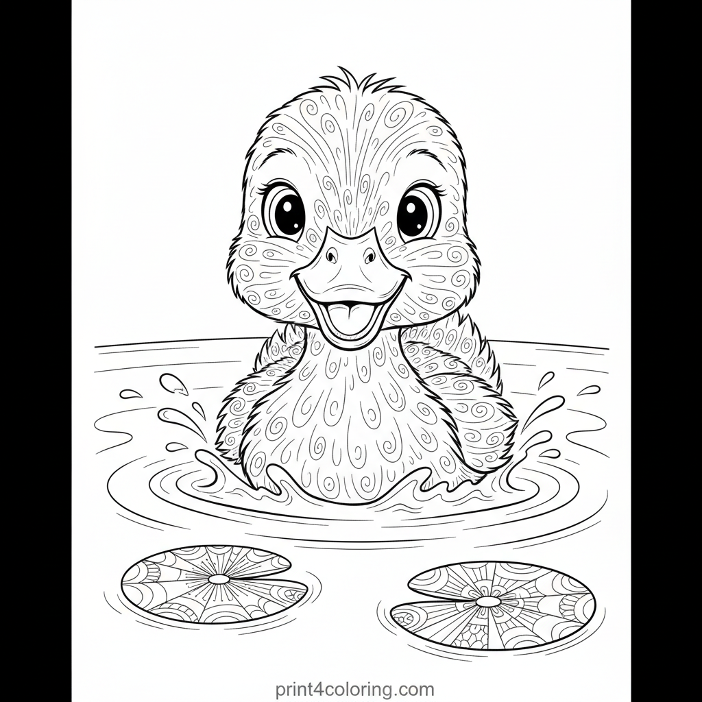 Witness a fluffy duckling's adorable first swim! This detailed close-up shows a curious little adventurer with big eyes, happily paddling through a calm pond. Intricate feathers, beautifully patterned lily pads, and a tiny splash await your vibrant colors to bring this heartwarming, watery scene to life.