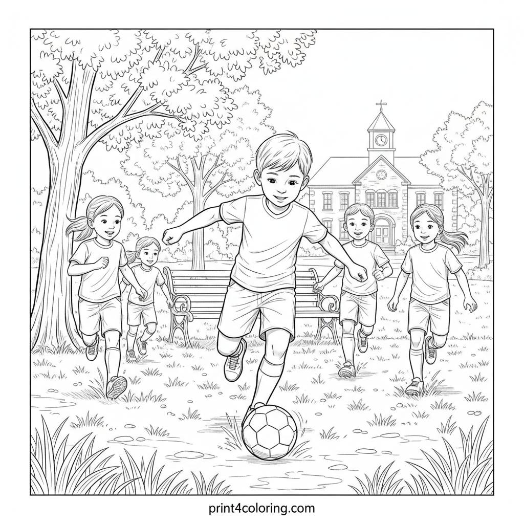 Get ready for action with this expert-level coloring page! Join diverse children in a thrilling soccer match at the park. One player skillfully dribbles the ball while teammates run nearby, surrounded by finely detailed trees, a classic park bench, and a distant school. Every line invites your artistic touch!