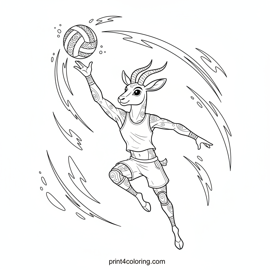 Leap into action with this dynamic coloring page! A graceful figure, perhaps a speedy gazelle or powerful athlete, soars mid-air, delivering an epic volleyball spike. The ball features cool geometric patterns, with radiating lines emphasizing incredible speed. Abstract energy bursts fill the background. A thrilling scene to bring to life with your colors!