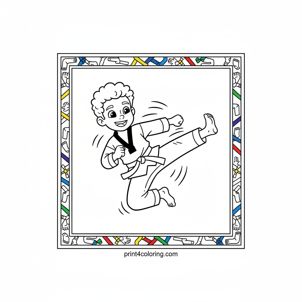 Leap into action with this exciting coloring page! A smiling child in a Taekwondo uniform is captured mid-air, performing a powerful and graceful jumping spin kick. Feel their joyful concentration as you add vibrant colors to this dynamic martial arts scene. It's time to create a masterpiece!