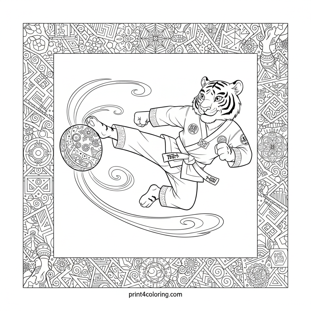 Dynamic Tiger Taekwondo Master: Flying Kick Precision Coloring Page