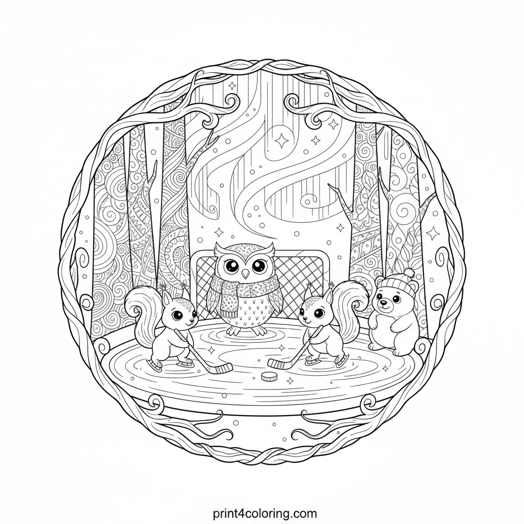 Dive into a magical woodland as a wise owl goalie and nimble squirrel forwards face off in an epic hockey game! Skate across a glowing ice pond beneath a sky ablaze with shimmering aurora borealis. Discover enchanting zentangle patterns on the ancient trees, adding a touch of intricate beauty to this cozy, whimsical winter wonderland.