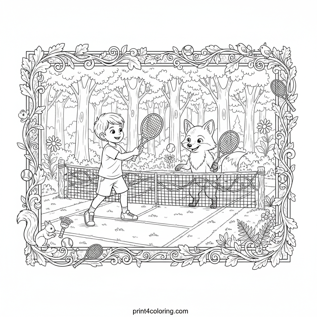 Join a friendly fox and a child in an expert-level forest tennis challenge! They play on a rustic court, featuring a net of woven branches and mossy lines. Surrounded by lush, sun-dappled trees and wildflowers, this whimsical scene invites your vibrant colors to bring its enchanting woodland charm to life.