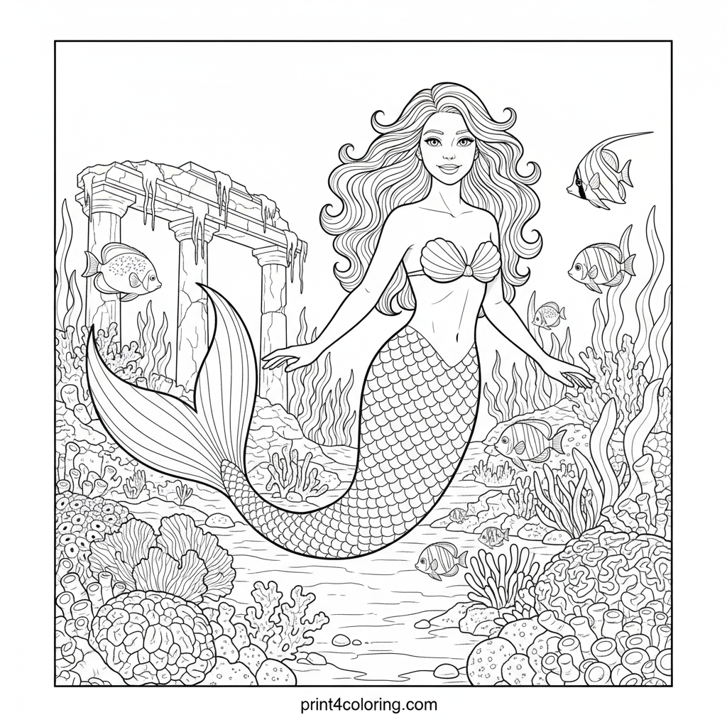 #mermaid#coral reef#underwater#ocean#fantasy#fish#ruins#mythical creature#coloring-page#printable