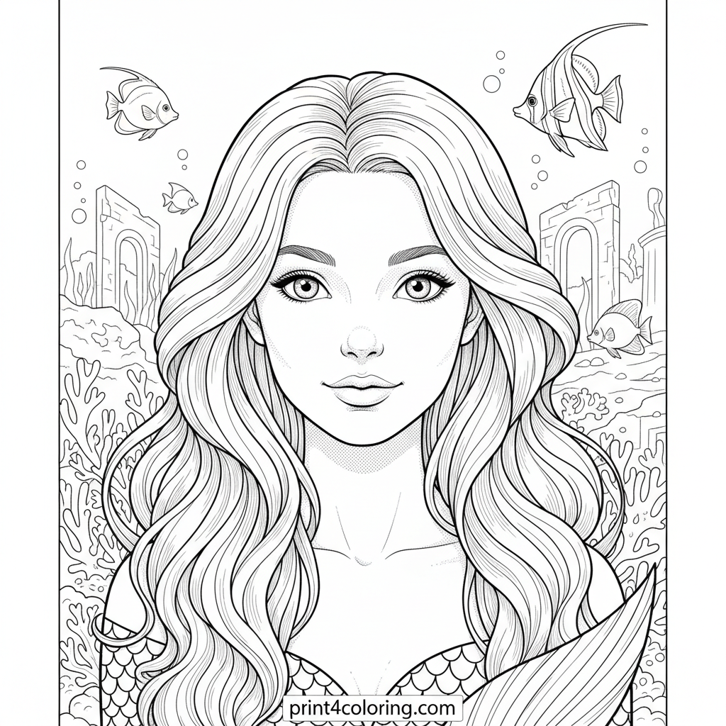 Dive into a magical underwater world with this expert-level coloring page! A graceful mermaid, adorned with intricate scales and flowing hair, gently navigates a vibrant coral reef. Explore the details of luminous exotic fish and ancient underwater ruins, bringing this enchanting close-up scene to life with your most vivid colors.