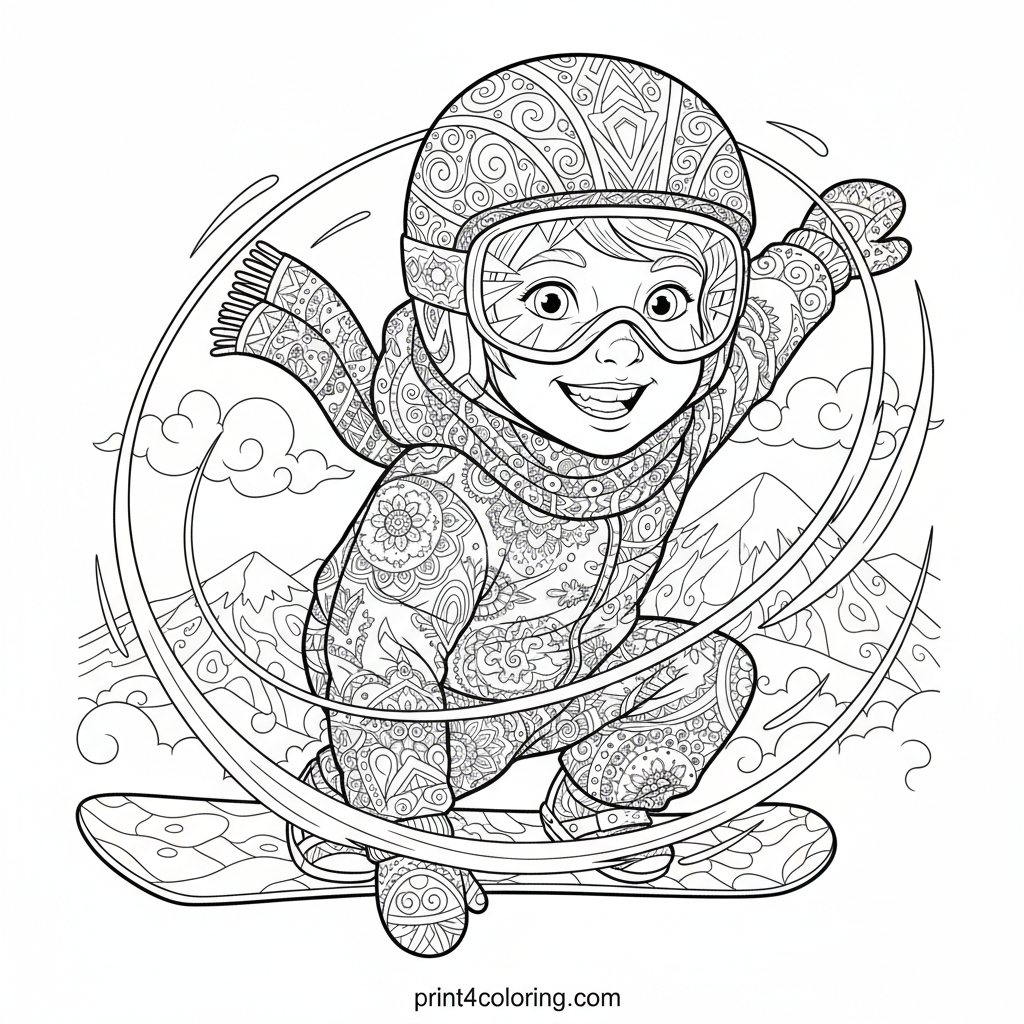 Get ready for an adrenaline rush with this awesome coloring page! Watch as our fearless snowboarder, mid-spin, defies gravity high above the snowy peaks. Geometric wind trails swirl around them, adding to the dynamic action. Bring this thrilling mountain adventure to life with your brightest colors and capture the excitement of a perfect trick!