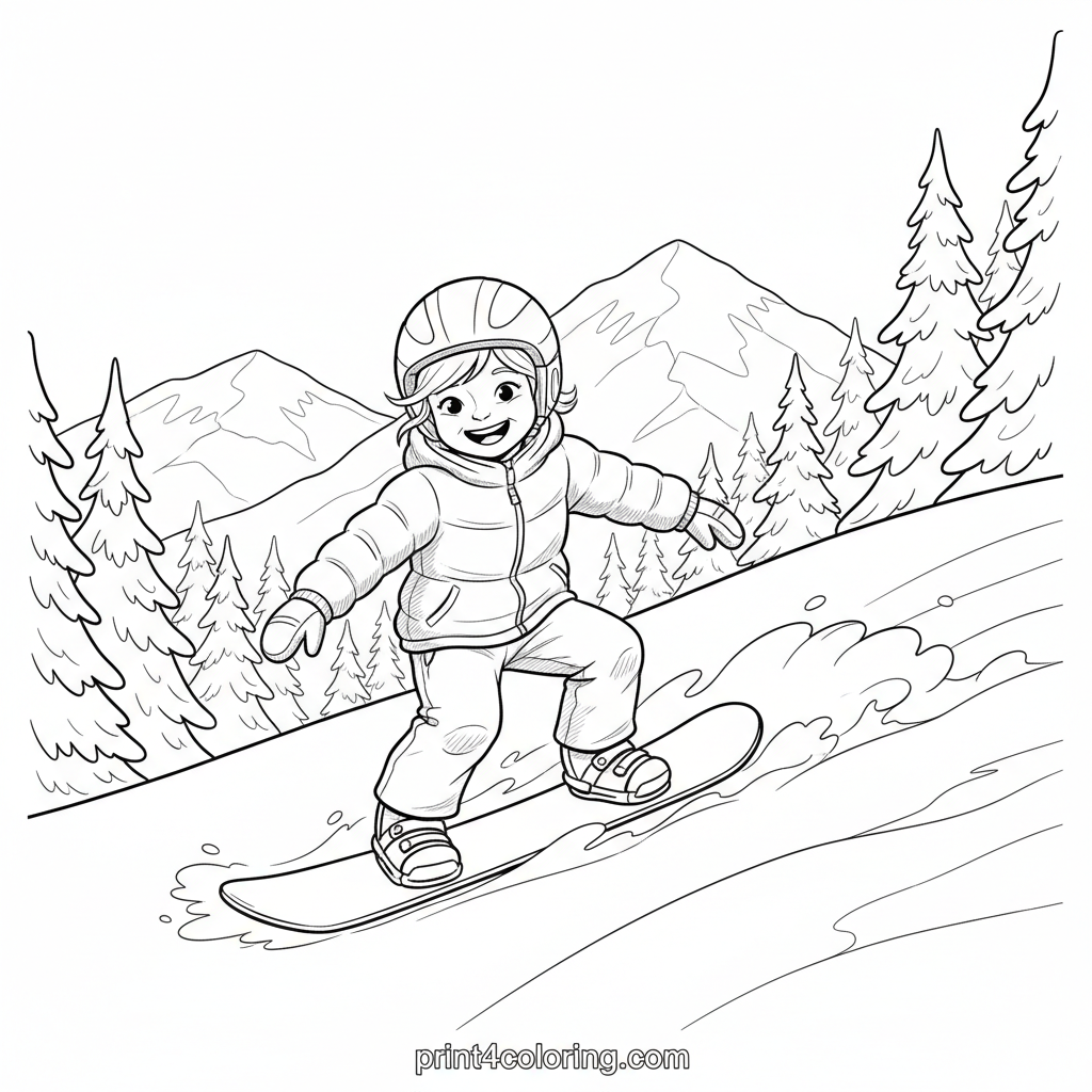 Get ready for an adrenaline rush! This expert-level coloring page captures a snowboarder in an epic mid-carve on a steep, snow-covered mountain. Experience the thrill of snow spraying, majestic peaks, and dense pine forests. Bring this dynamic winter wonderland to life with your most vibrant colors!