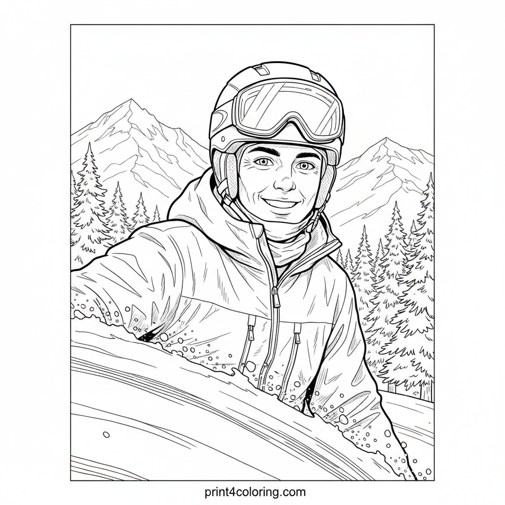 Zoom down the slopes with this dynamic coloring page featuring an expert snowboarder in a powerful mid-carve! Feel the thrill as snow sprays behind the board, set against a majestic backdrop of craggy peaks and dense pine forests under a vast sky. Capture the excitement of extreme winter sports!