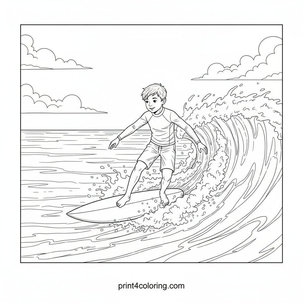 Catch the ultimate wave with this thrilling coloring page! A brave young surfer expertly conquers a powerful, curling ocean wave. Capture the dynamic energy of the sea with vibrant colors as water sprays and foam patterns swirl around the surfboard. Bring this exciting, sun-soaked adventure to life!