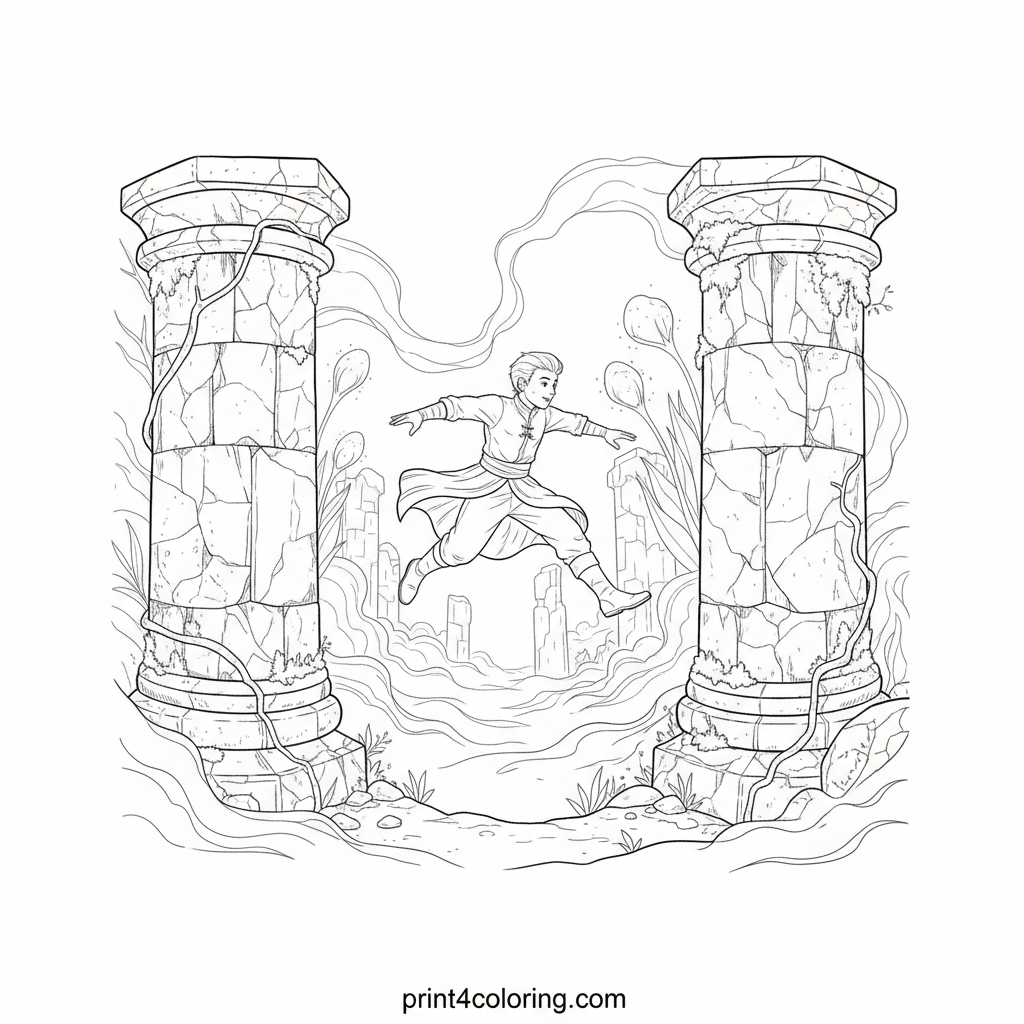 Leap into a world of ancient mystery with our Cloud Dancer! This detailed scene shows a graceful figure mid-air, dancing through vine-covered ruins. Swirling mist and magical glowing plants create an enchanting backdrop, inviting you to add vibrant colors to this fantastical adventure. Perfect for aspiring artists!