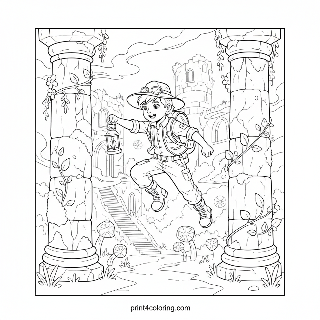 Embark on an epic coloring adventure! A graceful cloud dancer leaps through ancient, vine-covered ruins, a mystical spirit in an action pose. Swirling mist and magically glowing flora create a breathtaking, detailed scene. Bring this fantastical world to life with your expert coloring skills!
