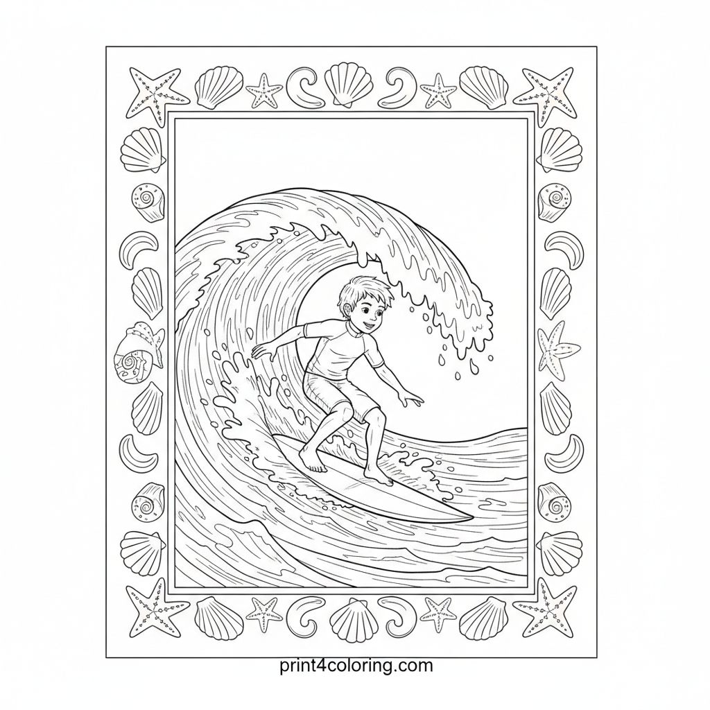 Witness an expert young surfer conquer a mighty ocean wave! This dynamic scene captures the thrill of the ride, with intricate water spray and foamy patterns erupting around the board. Bring movement and skill to life as you color this exciting, action-packed surfing adventure!