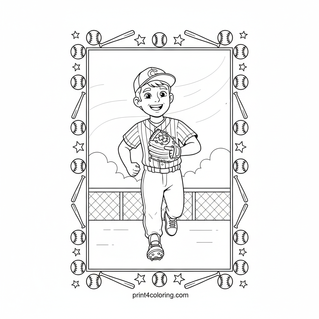Capture the thrill of a young baseball player, mid-stride, happily dashing towards first base! Their cap is a little crooked, and a detailed glove is ready. With a subtly sketched outfield fence and a sunny sky, this page invites you to add vibrant colors to this joyful moment on the field.