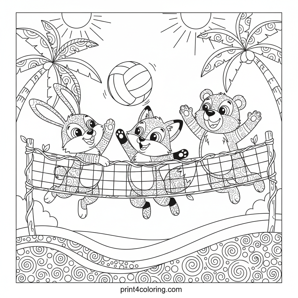 Join a delightful bunny, a clever fox, and a playful bear cub as they enjoy an exciting game of beach volleyball! Watch them bump a big, striped ball over a vine net on a sunny, sandy beach. Look closely for intricate zentangle patterns on their fur and the sand, adding a fun challenge to your coloring adventure.