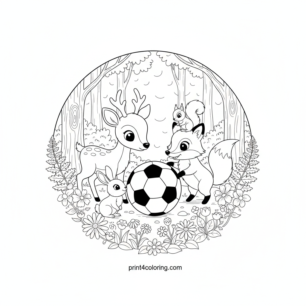 Explore a charming forest clearing where a curious deer, playful fox, watchful rabbit, and tiny squirrel have gathered around a classic soccer ball. This detailed scene captures the animals' realistic fur textures and expressions amidst lush ferns, wildflowers, and dappled sunlight. A delightful adventure awaits your colors!