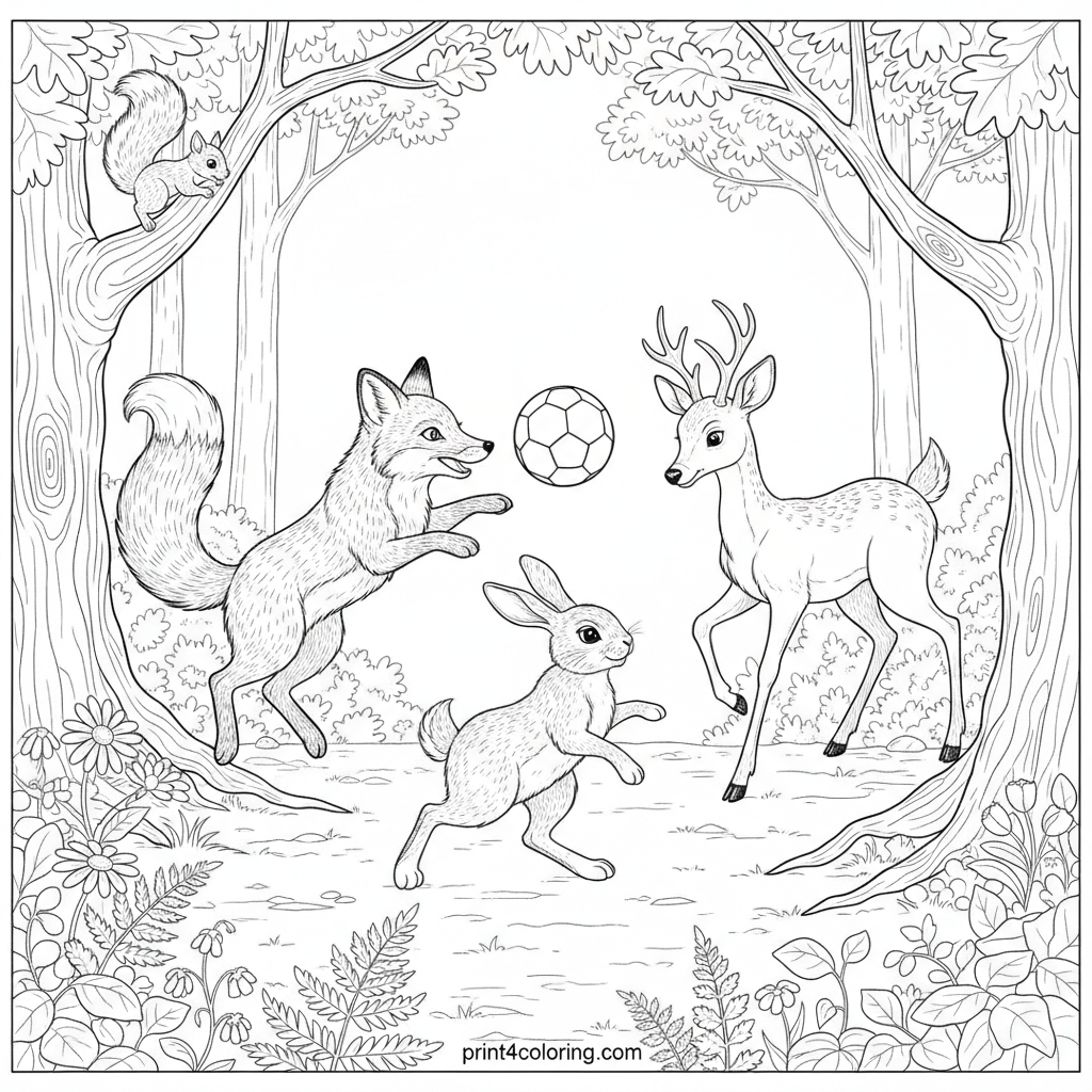 Join a curious deer, playful fox, watchful rabbit, and tiny squirrel as they discover a soccer ball in a vibrant forest clearing. This detailed scene captures the magic of nature, with fine fur textures, realistic expressions, and lush botanical elements like ferns and wildflowers under dappled sunlight. Perfect for coloring enthusiasts!