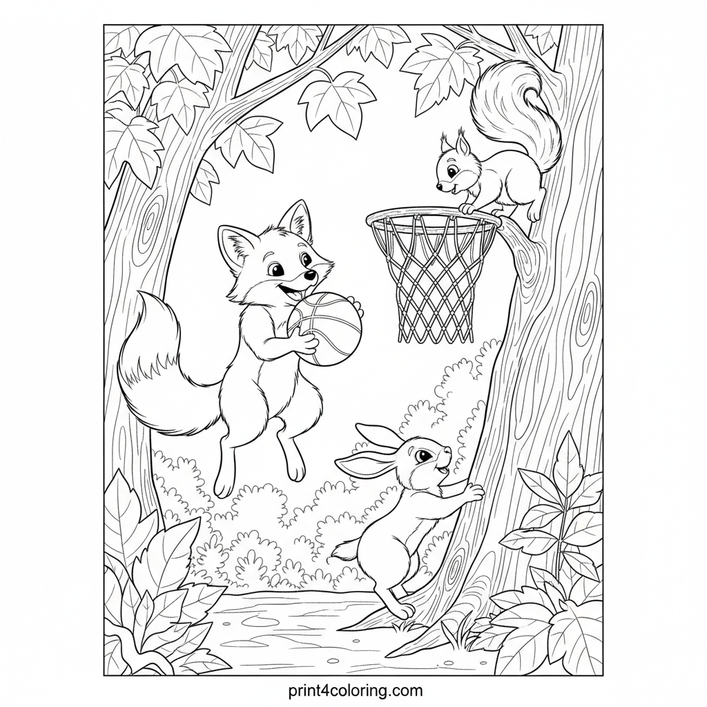 Join the fun in a sun-dappled forest clearing as woodland pals prepare for game day! A clever fox clutches a realistic basketball, while a busy squirrel and helpful rabbit meticulously set up a rustic hoop crafted from tree branches. Intricate leaves and textured bark fill the background, inviting you to add vibrant colors.