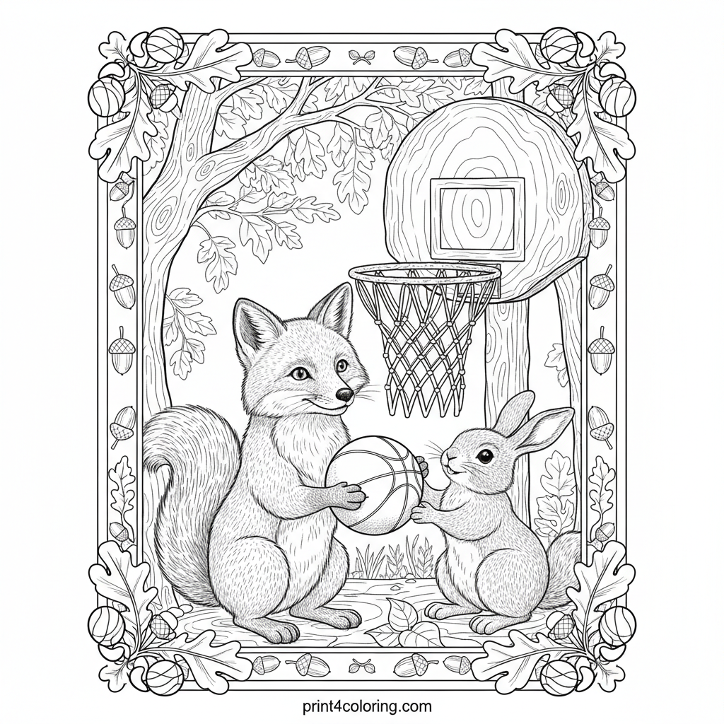Step into a sun-dappled forest clearing where a clever fox holds a basketball, ready for game day! A busy squirrel and a helpful rabbit carefully set up a rustic hoop made from tree branches. With intricate leaves and bark details, this charming scene invites you to bring the woodland fun to life with your most vibrant colors!