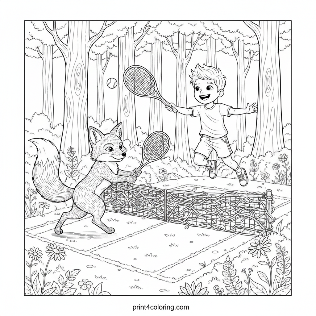 Forest Friends Tennis Challenge: Fox vs. Child Showdown Coloring Page