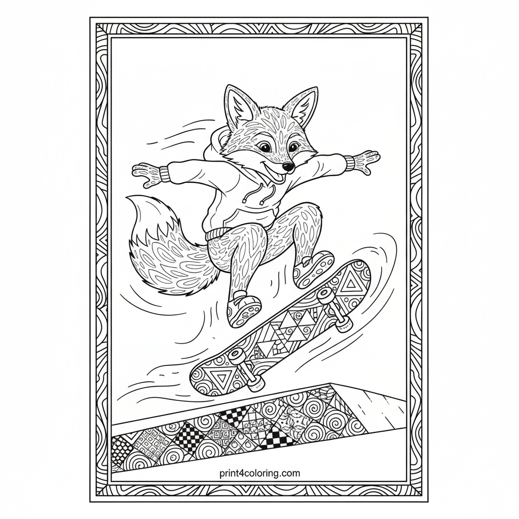 Get ready to color an amazing scene! Our cool skateboarding fox is soaring through the air, pulling off an incredible ollie over a stylish zentangle-patterned curb. Capture the thrill of motion with dynamic lines and intricate fur textures. Don't forget the fox's skateboard, featuring its own unique abstract design. Let your creativity flow!