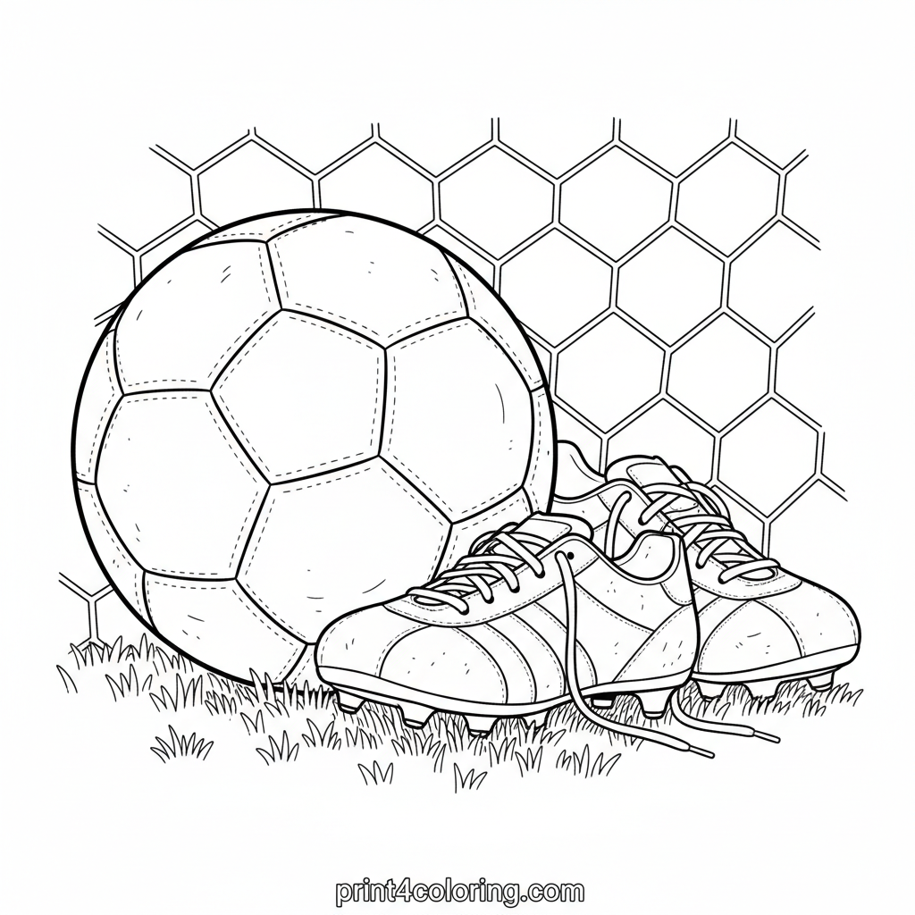 Get ready for kick-off with this incredibly detailed coloring page featuring classic soccer gear! A meticulously drawn soccer ball rests on finely textured grass, alongside vintage leather cleats showcasing their worn textures and laces. In the background, a realistic goal net awaits the next shot. Perfect for aspiring athletes and artists to bring to life!