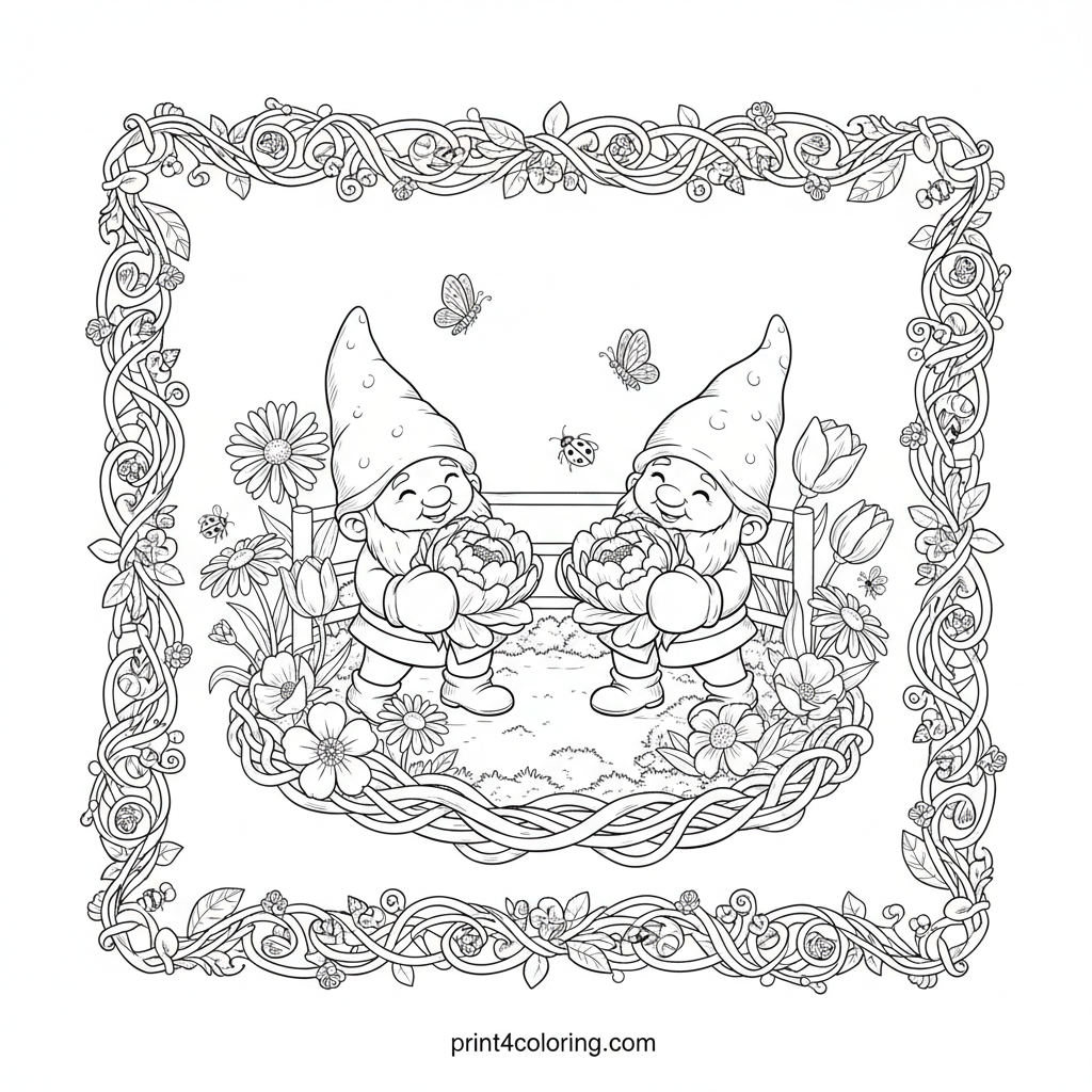 Dive into a whimsical garden scene where two happy gnomes are ready for a friendly "Petal Punch-Out"! They're holding soft flower blossoms like boxing gloves, within a tiny ring made of vines and moss. Surround them with vibrant garden flowers and delicate insects, bringing this charming, detailed world to life with your colors.