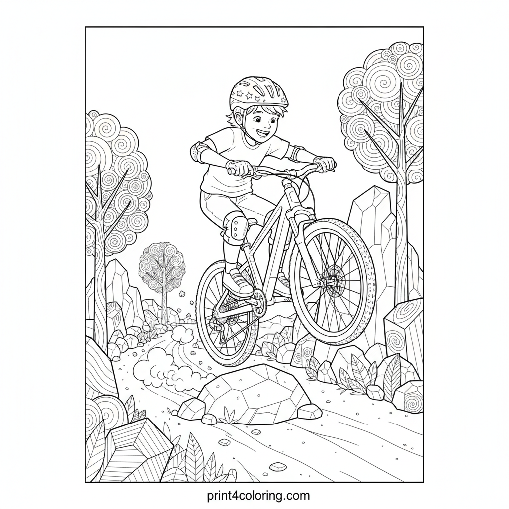Embark on an epic journey with our fearless cyclist as they conquer a winding mountain trail! This dynamic scene features a modern mountain biker in an action pose, navigating a landscape where every tree and rock hides fascinating geometric shapes and zentangle textures. Get ready to discover hidden patterns and bring this vibrant, adventurous world to life with your colors!
