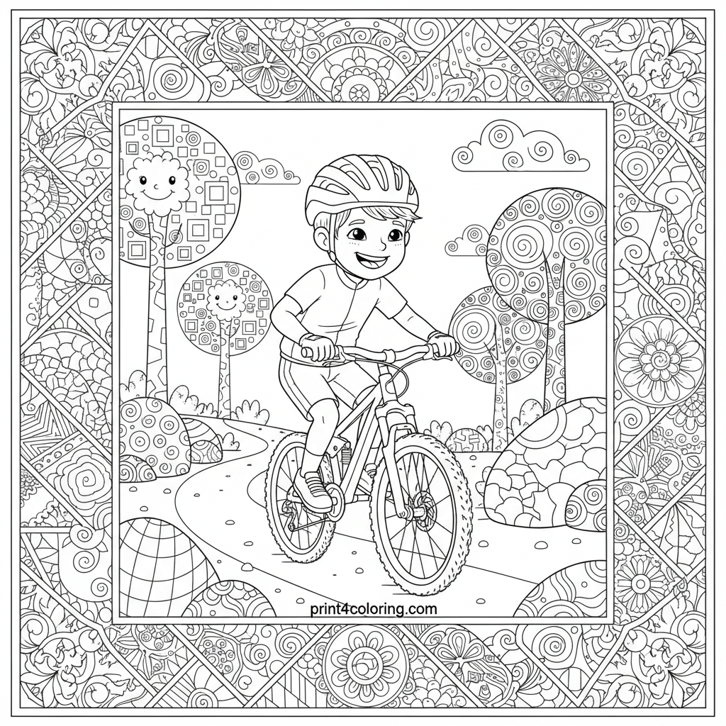 Embark on an epic journey with our fearless cyclist! This page features a bold adventurer on a sleek mountain bike, conquering a winding trail. Discover amazing geometric patterns and zentangle-inspired textures hidden within the trees and rocks. A challenging and rewarding coloring adventure awaits your creative colors!